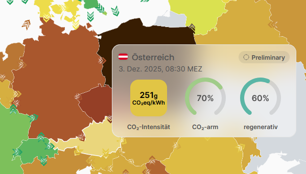 Electricity Maps ist eine Open-Source-Visualisierung, die Daten von Übertragungsnetzbetreibern weltweit aggregiert. Die Karte färbt Länder und Regionen basierend auf ihrer aktuellen CO₂-Intensität ein. Dunkelgrün bedeutet dementsprechend, dass in dem Land sehr geringe Emissionen durch die Stromerzeugung anfallen (oft dominiert durch Wasserkraft, Wind oder auch Kernenergie). Braun/Schwarz am anderen Ende der Skala steht für hohe Emissionen (hoher Anteil an fossiler Stromerzeugung). Zusätzlich zeigen animierte Pfeile, wie der Strom zwischen den Ländern fließt, welche Stromimporte und -exporte stattfinden.