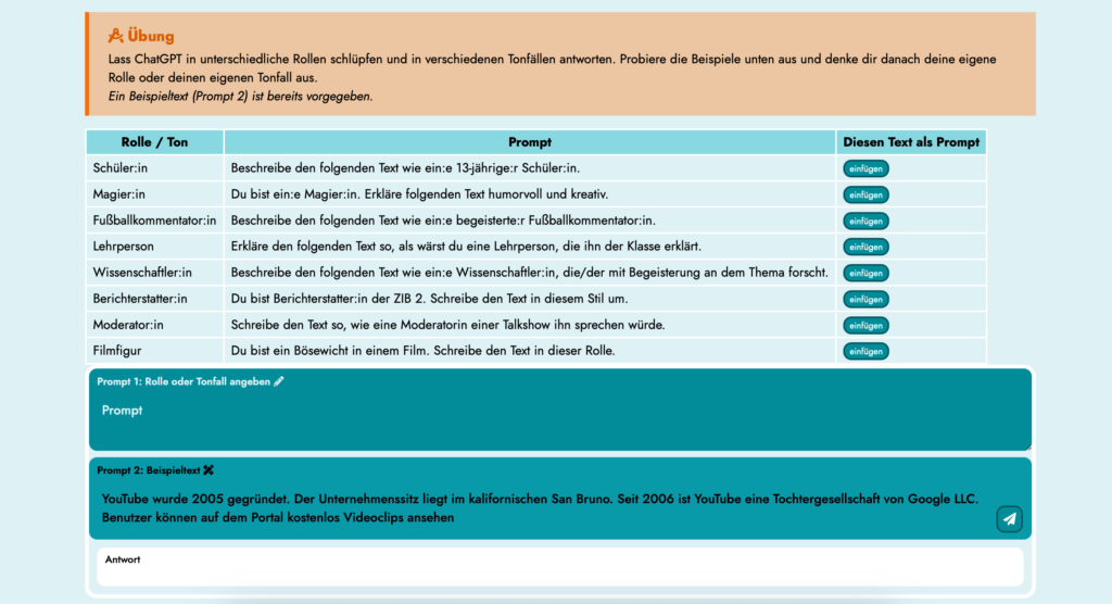 Screenshot: Interaktive Aufgabenstellungen in Modul 2 „Prompting“
