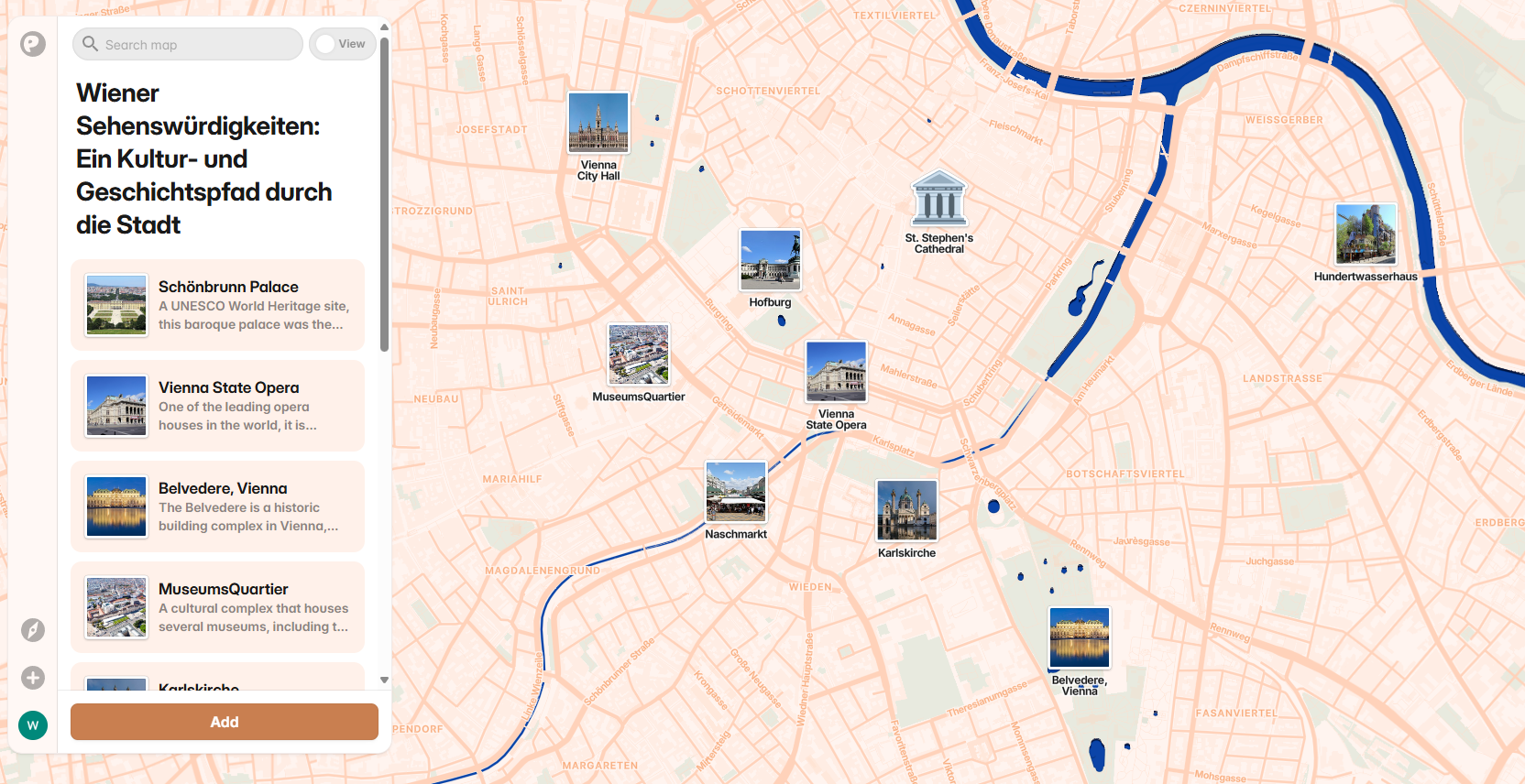 Mit dem ‚Add‘ button in der linken Leiste können Sie nach weiteren Punkten (in unserem Fall Sehenswürdigkeiten) suchen und in der Karte ergänzen.