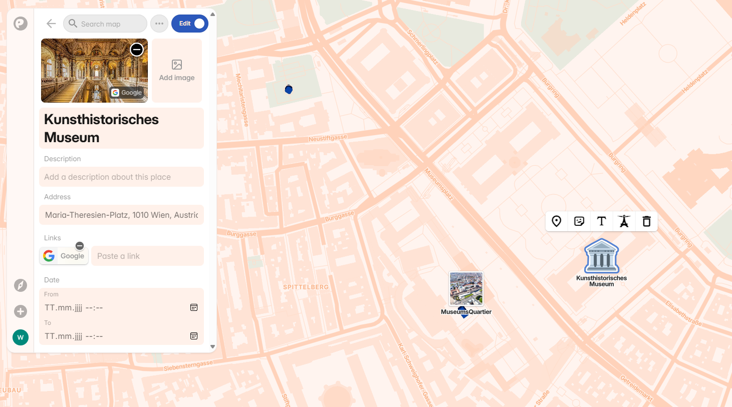 Ich habe z.B. nach dem Kunsthistorischen Museum gesucht. Es wird von PamPam sofort an der richtigen Stelle platziert und mit einer Standortmarke versehen.